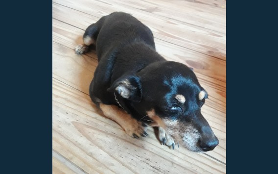 Adotado com 3 meses (atualmente com 7 anos), mestiço, 5kg, pêlo preto e caramelo, companheiro, brincalhão porém ciumento.